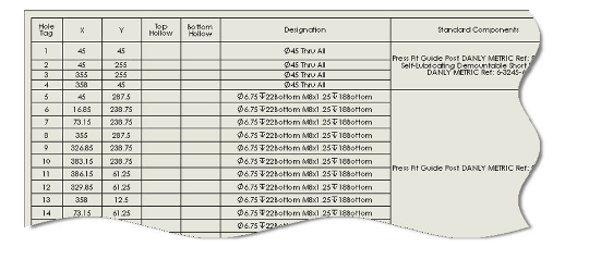 Paket za oblikovanje orodij nebi bil popoln brez kompletne in specifične funkcionalnosti, ki vsebuje tabele standardnih lukenj in izvrtin. S samo nekaj kliki boste prihranili veliko časa pri dimenzioniranju.